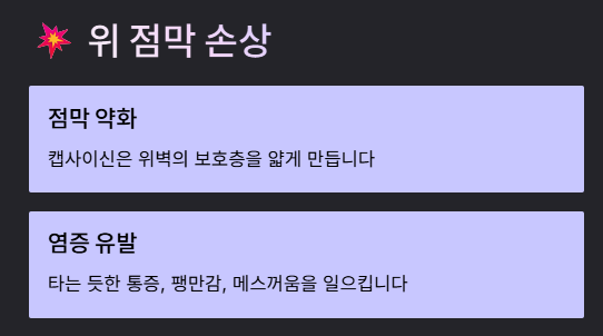 캡사이신은 위벽의 점막 보호층을 얇게 만들고 염증 반응을 일으킬 수 있습니다.