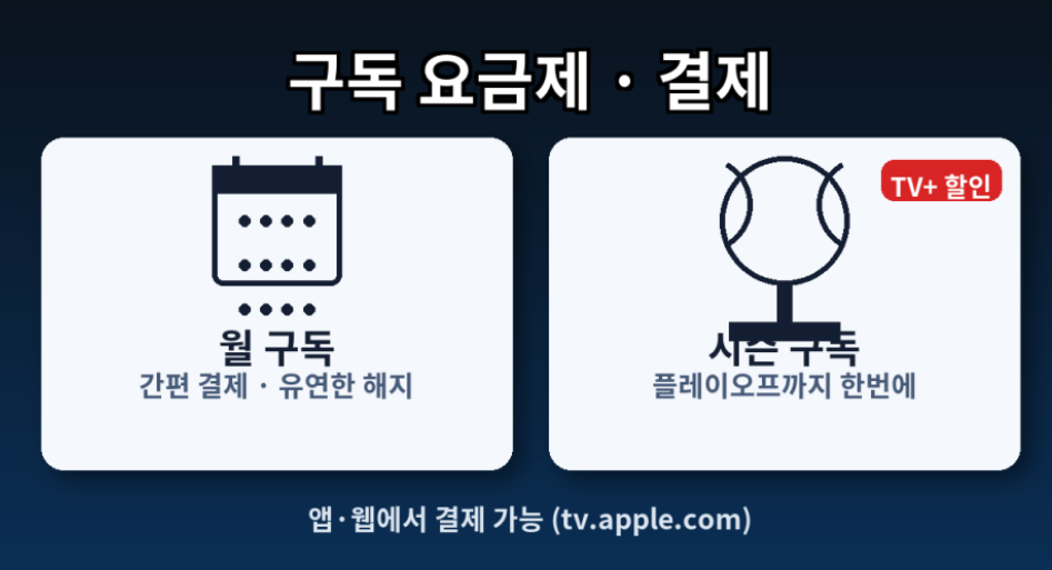 구독은 Apple TV 앱 내에서 Apple ID로 로그인 후 간단하게 결제가 가능하며, 웹(tv.apple.com/kr/sports)에서도 손쉽게 구독할 수 있습니다.