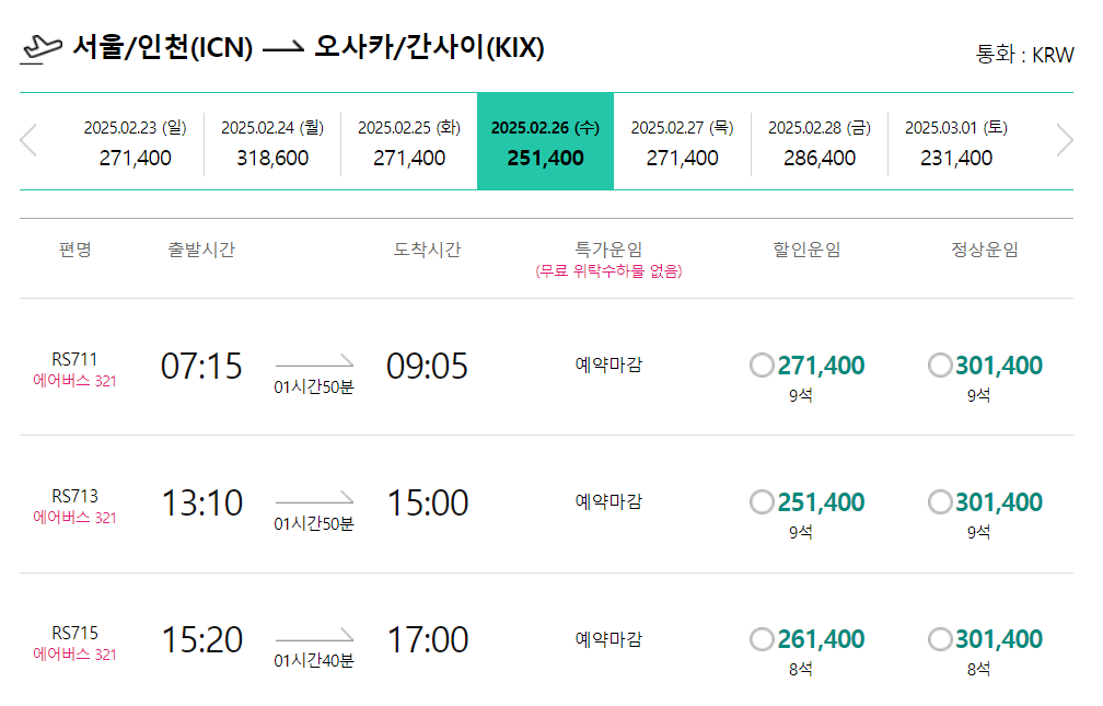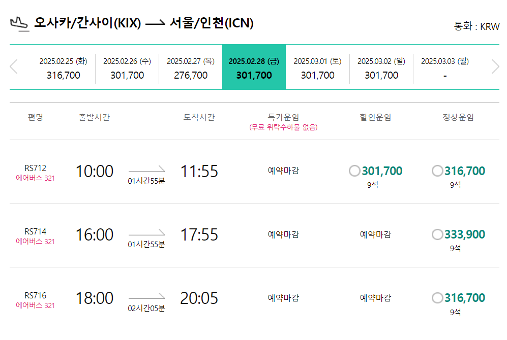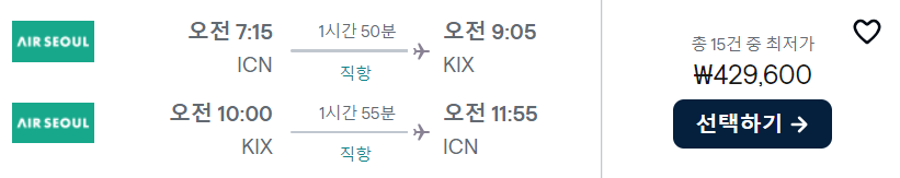 에어 서울 홈페이지에서는 아래와 같이 출발 최저가 251,400원 / 도착 최저가 301,700원으로 총 553,100원으로 조회가 됩니다.