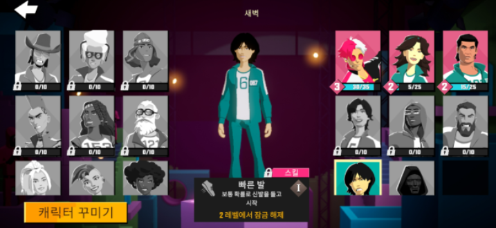 '무궁화 꽃이 피었습니다'에서 술래 역할의 로봇 '영희'가 각 맵에서 색다른 모습으로 등장하는가하면, 시즌1의 등장인물인 '새벽', '덕수' 등을 캐릭터로 사용할 수도 있습니다. 주인공 '기훈'은 빨간색 머리에 파란색 수트를 입은 모습의 코스튬이 있어 시즌1의 마지막 장면을 연상케 합니다.