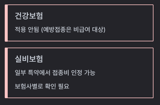 다만, 일부 지자체에서는 경제적 부담 완화를 위해 무료 접종 지원 사업을 운영 중이며, 접종 이후 부작용이나 치료가 필요한 경우 실비보험 청구가 가능합니다.