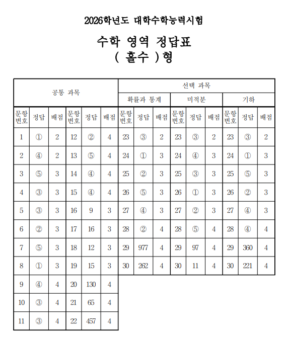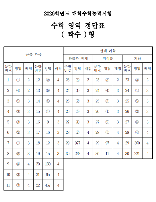 2026학년도 대학수학능력시험 수학 영역 문제지와 정답지가 공개되었습니다.